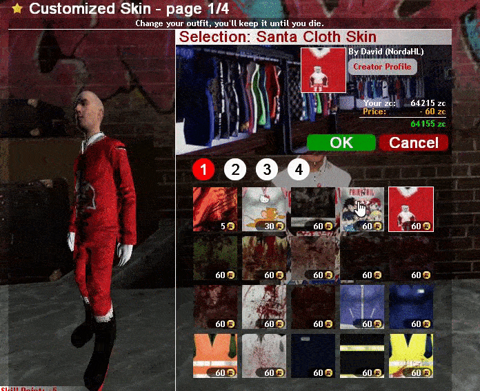 To make an appointment with a game skin merchant, from his interface you can see the list of skins. Click on the garment and you will see your survivor model on the left update with the selected skin, confirmed to get it by clicking OK. You'll then be locked in with your new unique skin, and the seller will be notified of the sale and the 50% zcoins you've earned.