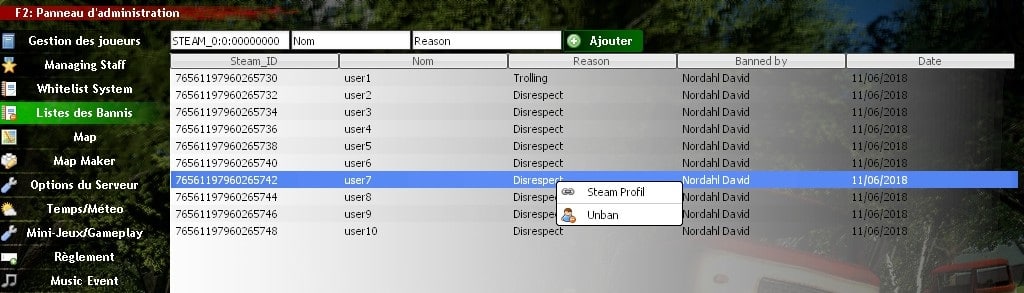 Vous pouvez ajouter manuellement un Moderateur ou Admin insérant le Steam ID et le nom dans le haut du tableau.