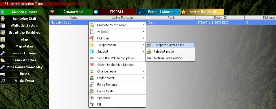 Depuis le menu F2, vous pouvez voir la liste des joueurs, c'est ici que se passe toute la partie gestion administration du serveur.