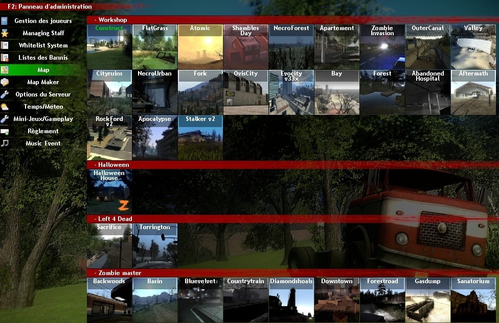 Pour changer la map sur un serveur, il suffit tout simplement de cliquer sur une des maps de la liste. Il y a actuellement 33 maps.