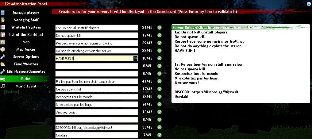 Pour paramétrer les règles de votre serveur, entrez votre texte et pressez ENTER pour valider la ligne.