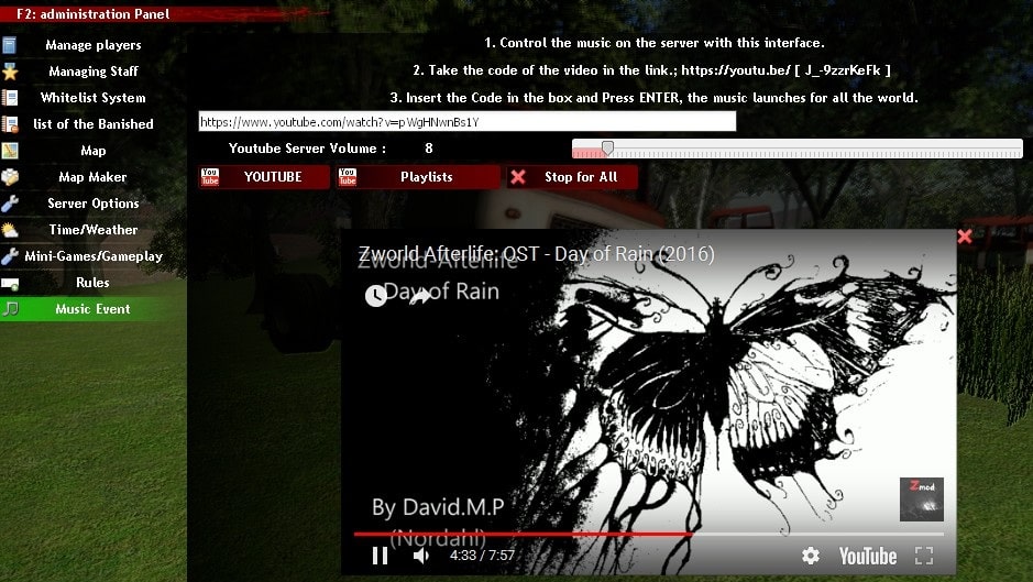 Trouver des musiques sur Youtube et les lancer sur tout le serveur de façon fluide et optimisée pour organiser vos Events, c'est possible sur Zworld-Afterlife. Copiez coller le lien de votre vidéo dans le petit emplacement et faites "Entrée". La musique sera alors lancée pour tout le monde.