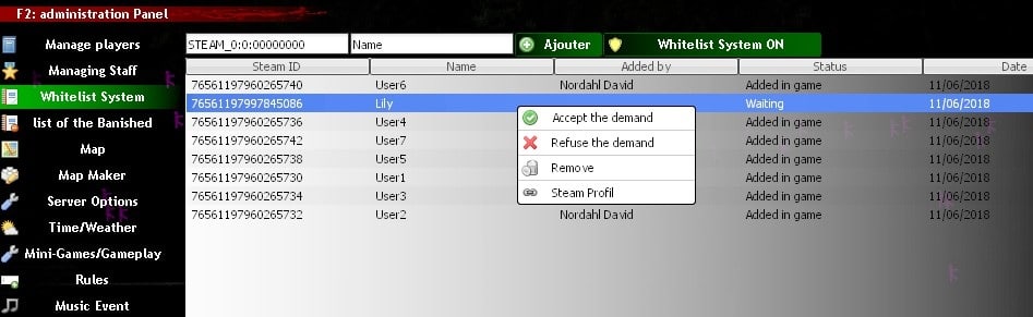 En jeu, il est possible d'accepter la demande d'adhésion à la Whitelist d'un simple clic droit sur le nom. Le choix de supprimer est aussi inclus.