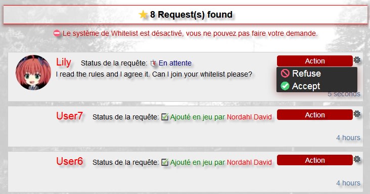 Les joueurs peuvent demander à rejoindre votre Whitelist depuis le site. Cela vous permet d'améliorer la qualité du public sur vos serveurs en limitant l'accès aux trolls.