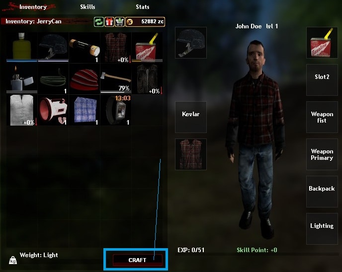 ☰ 1.1 Pour acceder au menu de craft ouvrez votre inventaire 'Q', en bas à droite vous trouverez le bouton 'CRAFT'