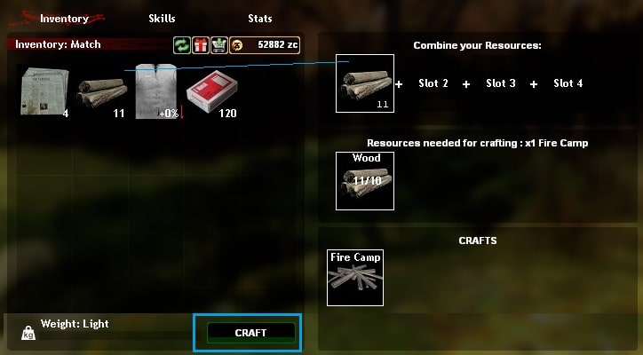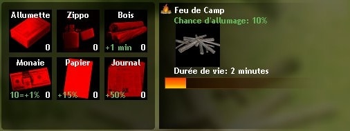 Les allumettes ou le zipo | Utilisez les allumettes ou le zippo pour faire une tentative d'allumage.Chaque tentative échouée augmente le taux de chance d'allumage de +1% |
