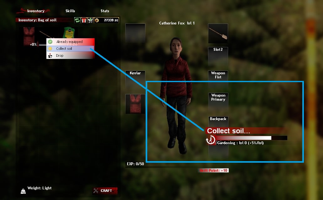 Pour collecter la terre, il vous faut un sac de terre dans votre inventaire, et surtout équiper votre pelle dans les mains, cliquez sur la pelle depuis l'inventaire sur des zones où la terre est de bonne qualité, là ou il y a de la végétation.