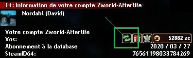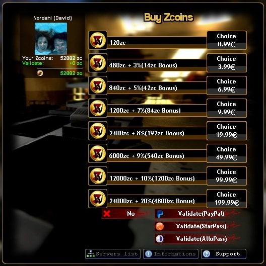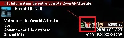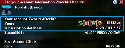 ☰ Vous pourrez voir vos Zcoin dans le menu d'information de votre compte avec la touche F4, depuis votre inventaire, ou sur le site web.
