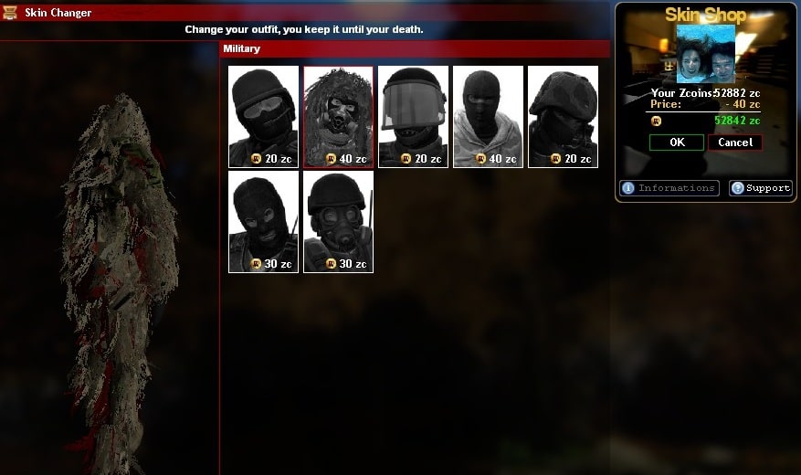 Les skins militaires ne vous donnent pas de bonus spéciaux. La modification n'est pas définitive, si vous mourez vous la perdez. Si vous avez activé votre compte, lorsque vous vous déconnectez, vous pourrez retrouver votre survivant avec le skin modifié lors de votre prochaine partie.