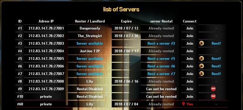 ☰ La liste des serveurs officiels est affichée, vous indiquant les serveurs disponibles à la location.