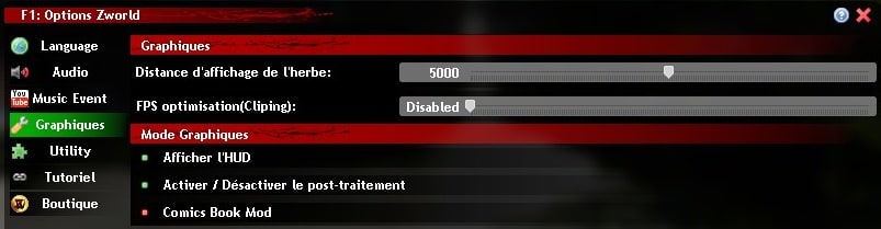 Cela permet également d'activer ou de désactiver le Post-Processing, la musique, l'HUD, d'activer le mod Graphique Comics Book et beaucoup plus encore.