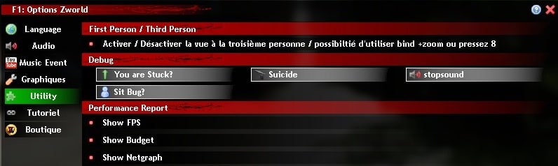 Suicide : Vous pouvez déclencher votre mort, ce bouton est un privilège réservé aux comptes actifs, trop de comptes guest l'utilise pour respawner.